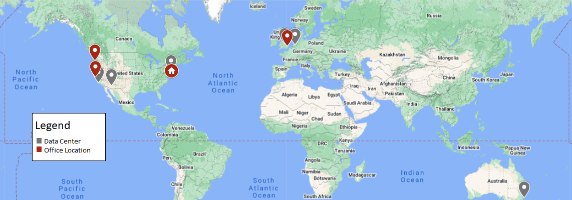 GNS is continuing to add new data centers each year. Production systems are hosted close to the end-users for good performance. Disaster recovery is typically at least 1,000 miles away for complete redundancy and isolation.